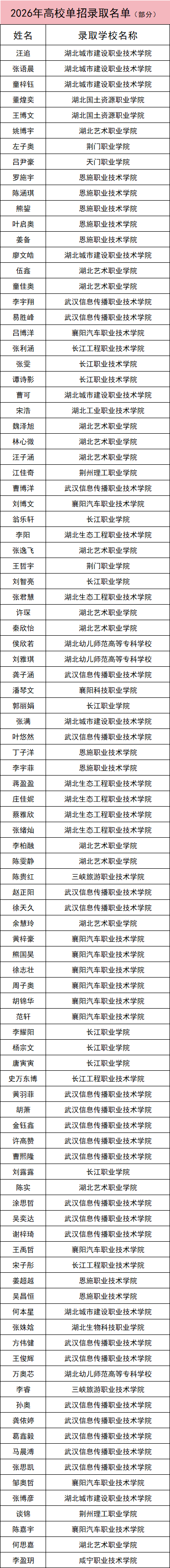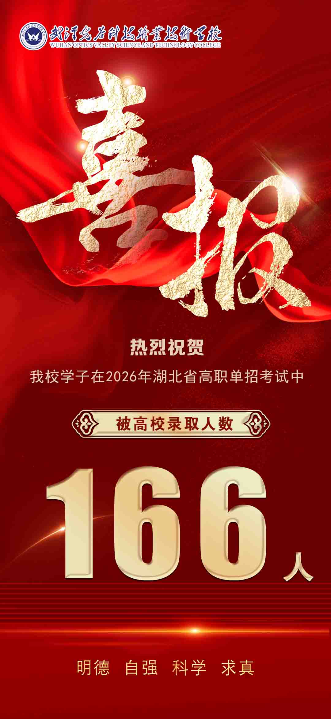 在2026年湖北省高职单招考试中,我校学子凭借扎实的学识、过硬的技能和出色的综合素养,166名学子成功被高校录取!这一优异成绩充分彰显了我校的育人成果与办学实力,更是全体师生同心同德、砥砺奋进的最好见证!