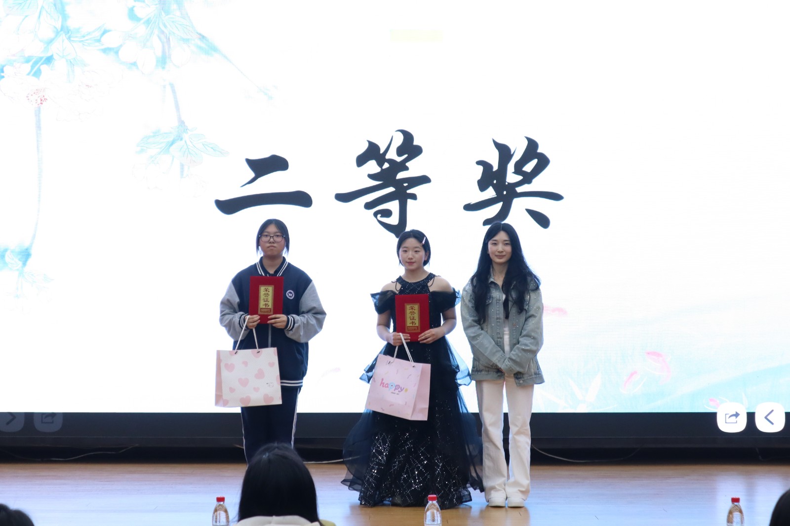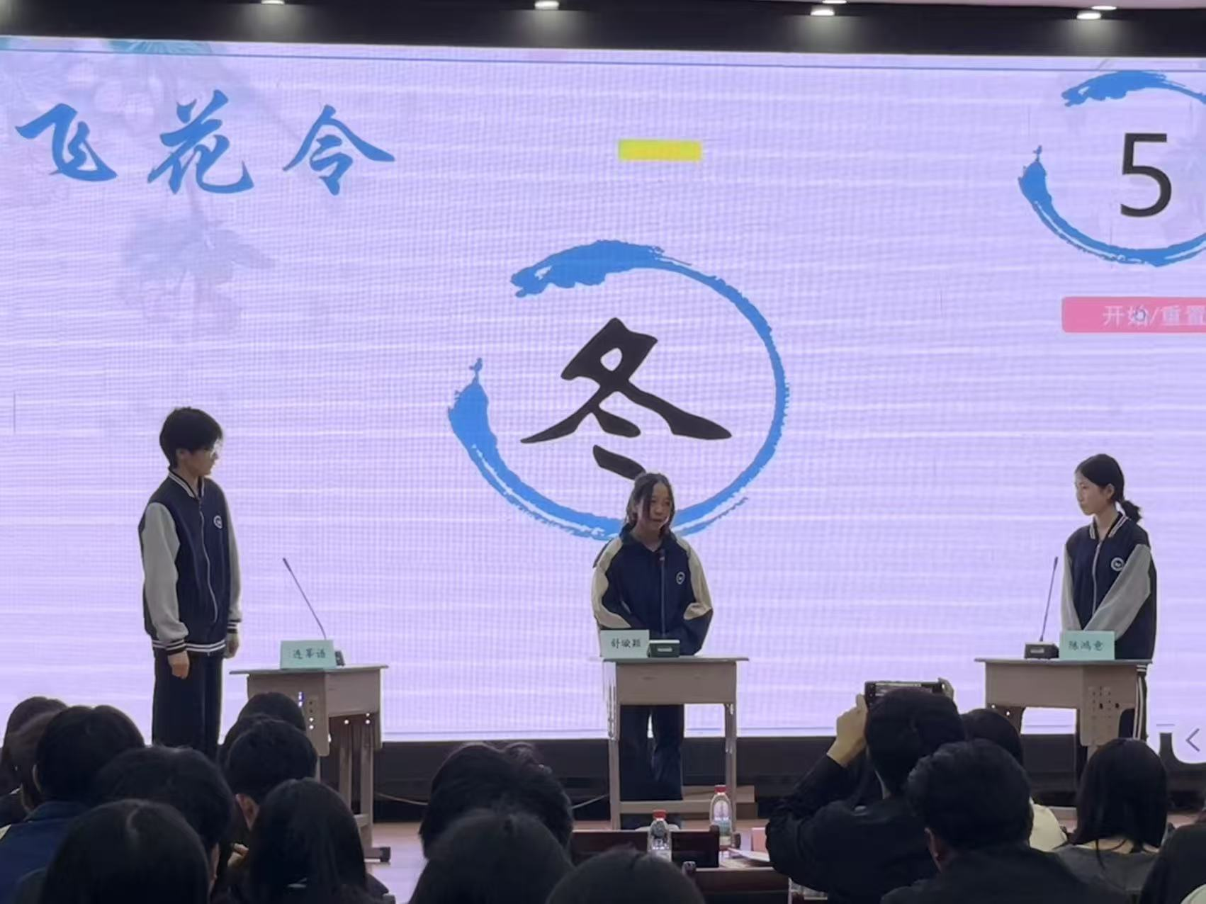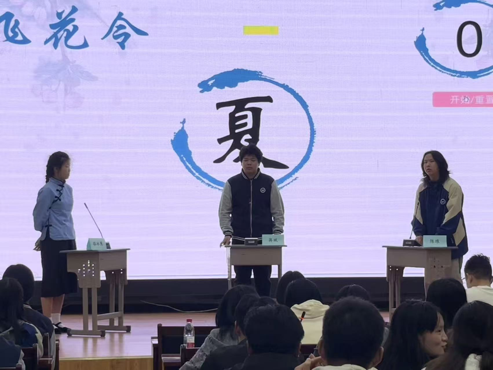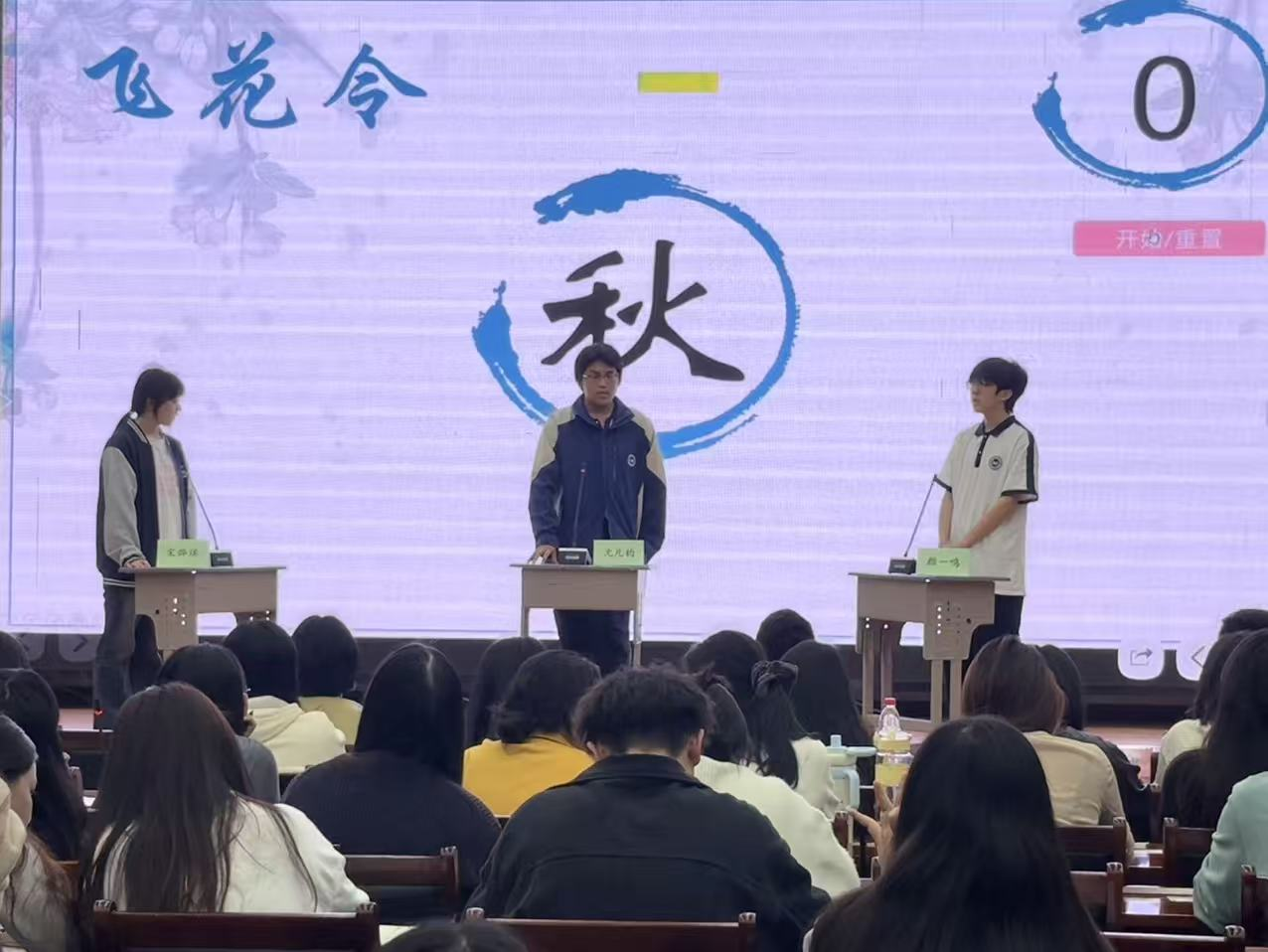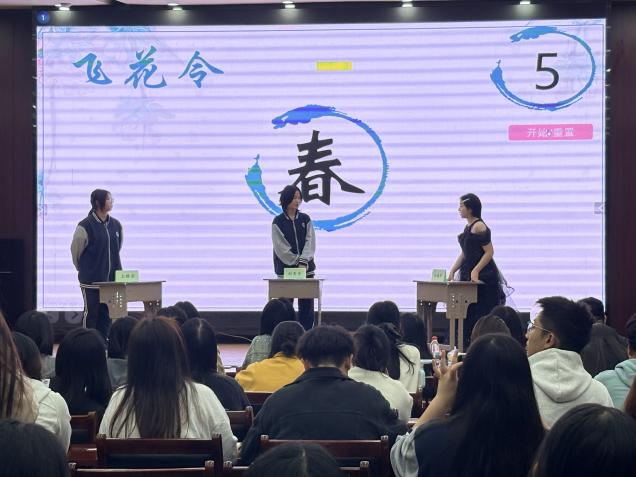 随后,进入紧张刺激的“飞花令”环节。选手们通过抽签组队,围绕“春”“夏”“秋”“冬”四大主题展开诗词对决,大家反应敏捷、出口成章,一句句经典诗词脱口而出。去年的比赛冠军曹文慧同学作为神秘嘉宾登台,与参赛选手同台切磋、以诗会友,现场氛围被推向高潮,掌声、欢呼声此起彼伏。