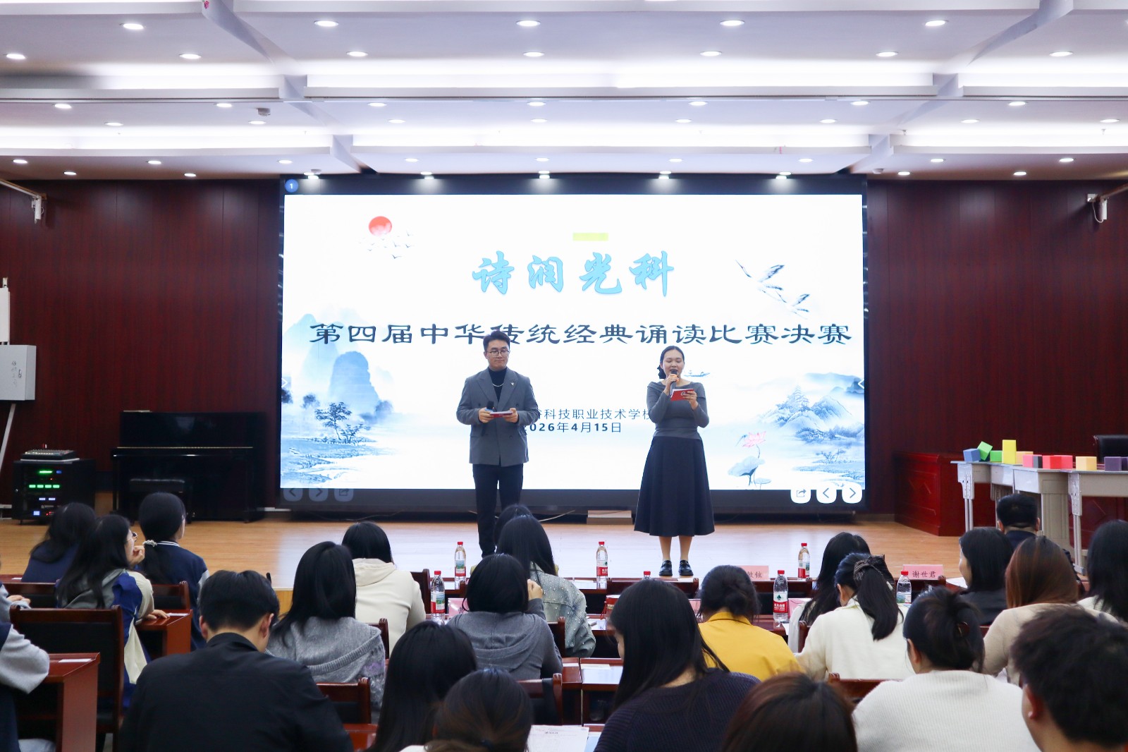 以诗为媒,以声传情。4月15日16时,第四届“诗润光科”中华传统文化诵读比赛在校园内如期举行。校长谢世君、常务副校长余敏铉、党支部书记兼副校长潘喜梅、副校长熊科莅临现场指导,五位专业评委老师参与评审,与数十名教师代表、百名学生代表共同见证了这场诗意盎然的视听盛宴。