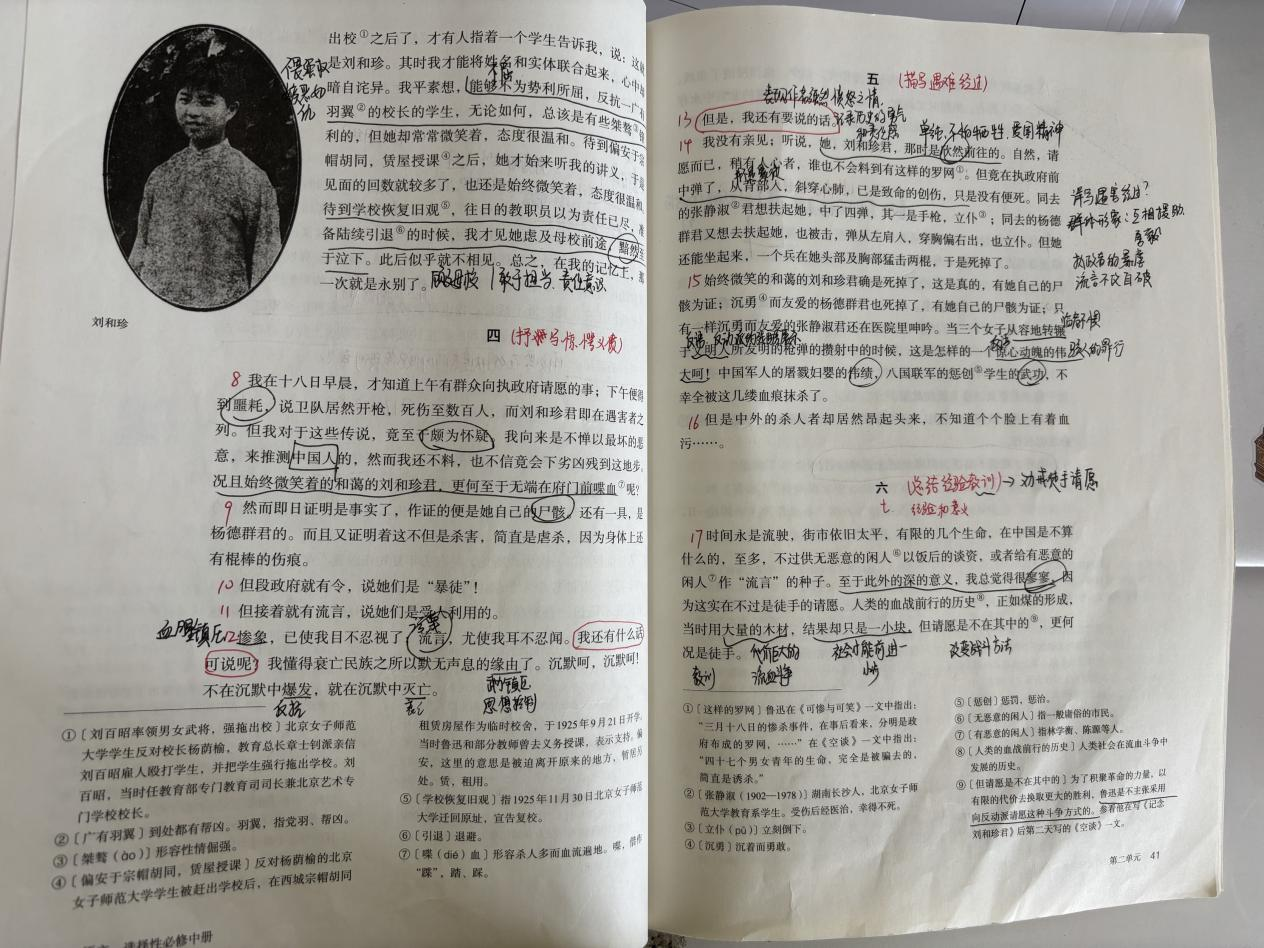 我也热衷于用现代教育技术为备课赋能。备《包身工》时,筛选相关纪录片片段与历史影像资料,让学生直观感受旧中国包身工的悲惨处境;备《屈原列传》时,结合楚辞吟诵音频、屈原相关历史动画,让学生在视听沉浸中感受古典文学的韵律之美与历史厚重感;备《记念刘和珍君》时,制作互动课件整合五四时期历史背景资料,设计课堂辩论、片段朗读等环节,让语文课堂从“单向讲解”变为“双向互动”。每一份教案都经过反复修改,每一个教学环节都经过多次推敲,只为让课堂更具吸引力、感染力和实效性。