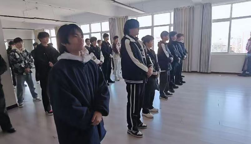 随着训练的深入,形体房里渐渐响起整齐的呼吸声。同学们凝神专注,眼神平视前方,嘴角带着自然的微笑。男生们练起前腹分腿式、背手分腿式站姿,双手或交叉腹前或背于身后,双腿分开与肩同宽,尽显沉稳干练;女生们则以丁字步、扇形步站姿展现优雅,双手轻叠于腹前,脚尖呈45度舒展,身姿窈窕却不失力量。汗水顺着额头滑落,浸湿了运动服的领口,但没有同学轻言放弃。当老师宣布“保持这个姿势五分钟”时,大家相互鼓劲,在肌肉的酸胀感中坚守着标准姿态,眼神里满是执着与坚定。