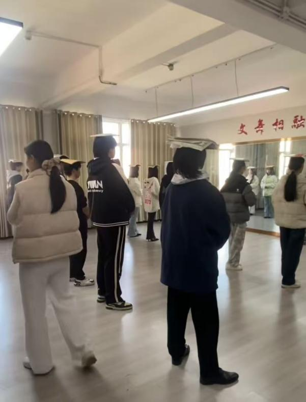 训练伊始,看似简单的站姿让不少同学直呼“难度超标”。有的同学不自觉地含胸塌肩,有的则双腿僵硬、重心摇晃,还有的肩膀紧绷得如同拉满的弓弦。老师耐心地帮同学们调整姿态:轻轻扶正歪斜的头部,纠正内扣的肩膀,提醒收紧松弛的核心,用教学棒校准双腿的角度。为了让大家更好地找到身体记忆,老师带领同学们开展靠墙站立练习,脚后跟、小腿肚、臀峰、肩膀、后脑勺紧贴墙面,感受脊柱向上延伸的力量,腰部保留一拳宽的自然弧度,在静态坚持中锤炼肌肉控制力。