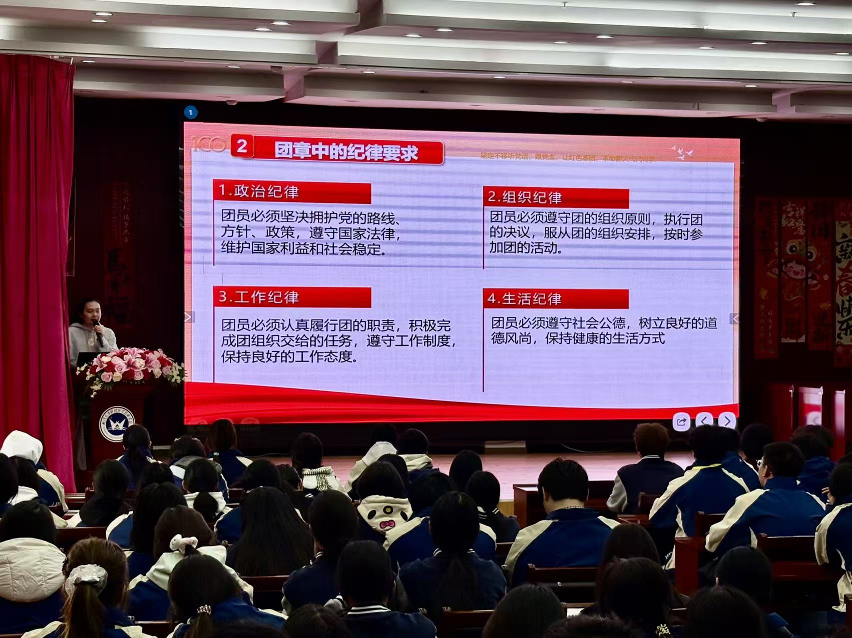 本次会议以“崇德向善,严守团纪”为主题,围绕团员义务履行、纪律遵守、作用发挥等方面展开深入交流与评议。会议由校团委何林璇老师主持,校长谢世君、党支部书记、副校长潘喜梅、党支部宣传委员黄玲玲、校团委书记张怡平及全校197名团员共同参会。