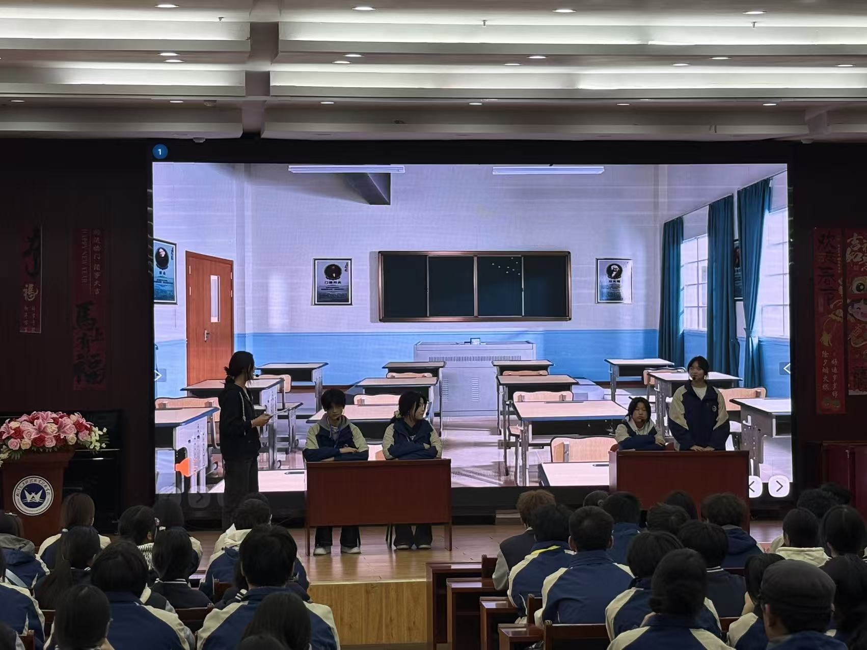会议在庄严的国歌声中拉开序幕。随后,全体与会人员共同观看了由我校团员代表与学生会成员代表联合编排的“反霸凌”主题情景短剧《裂缝中的阳光》。该剧通过真实场景再现,深刻揭示了校园欺凌的危害,倡导团员青年主动担当,带头营造反对霸凌、关爱同学、和谐友爱的校园氛围。